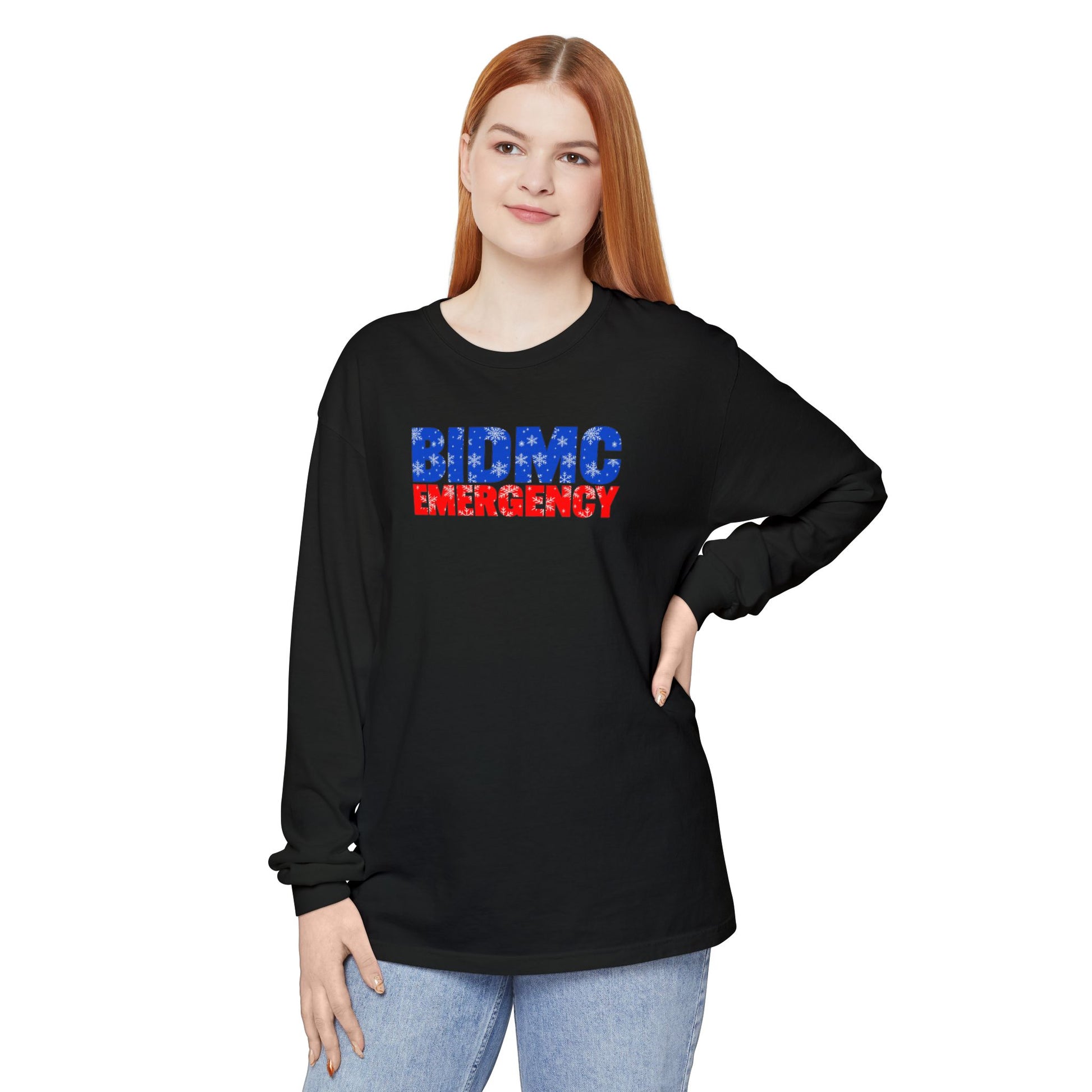 BIDMC Emergency Winter Long Sleeve Rep your department with this cozy cold-weather essential. The Comfort Colors longsleeve features a bold "BIDMC EMERGENCY" graphic—distressed blue lettering with a subtle seasonal twist, paired with vivid red block text below. Designed for Beth Israel Boston Medical Center staff, supporters, and anyone who stands with Boston’s emergency care heroes.