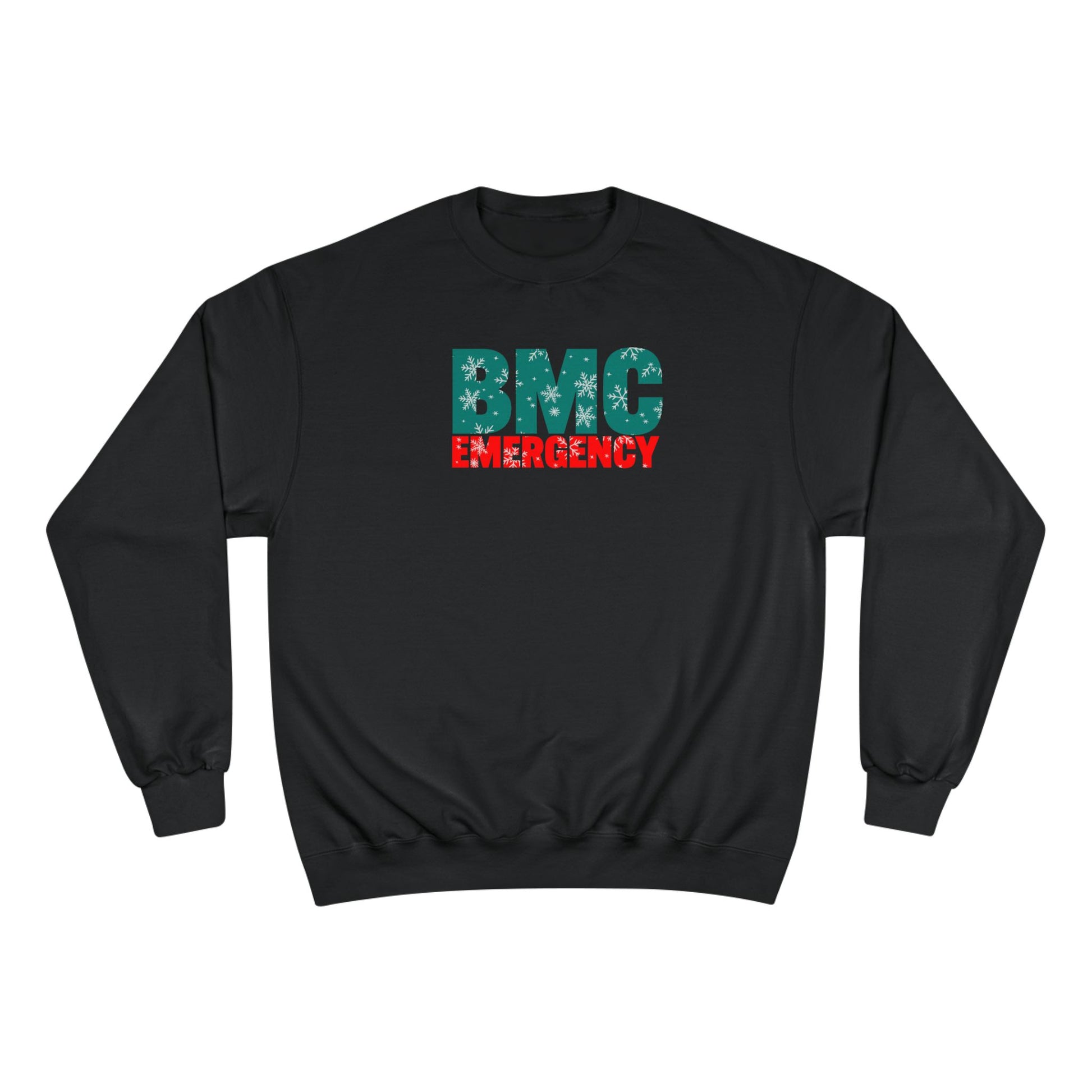 BMC Emergency Winter Sweatshirt Stay warm and rep your department with this cozy cold-weather essential. The light gray sweatshirt features a bold "BMC EMERGENCY" graphic—distressed blue lettering with a subtle seasonal twist, paired with vivid red block text below. Designed for Beth Israel Boston Medical Center staff, supporters, and anyone who stands with Boston’s emergency care heroes.