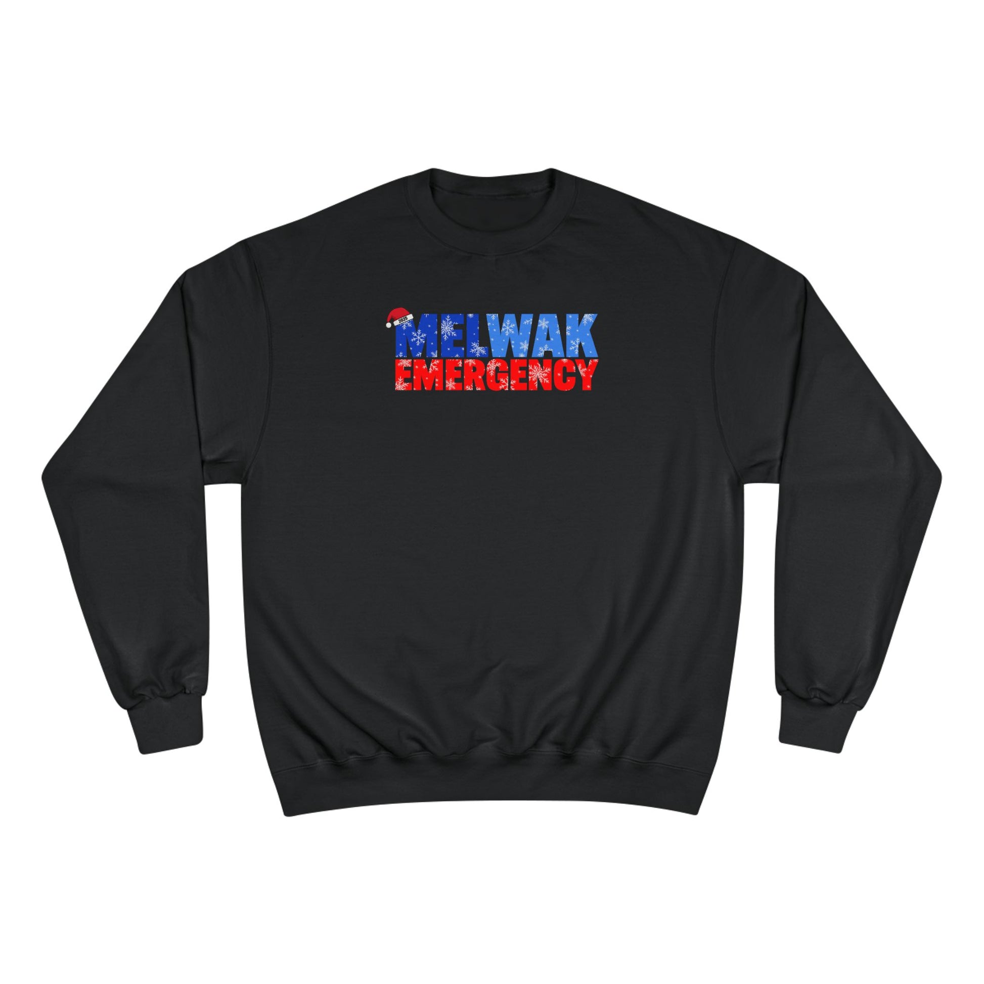 MELWAK Emergency Holiday Sweatshirt Celebrate the season with Boston spirit and emergency department pride. This cozy light gray sweatshirt features a bold "MELWAK EMERGENCY" graphic—distressed blue lettering topped with a festive red Santa hat, paired with striking red block text below. Designed for staff, supporters, and anyone who reps MELWAK.