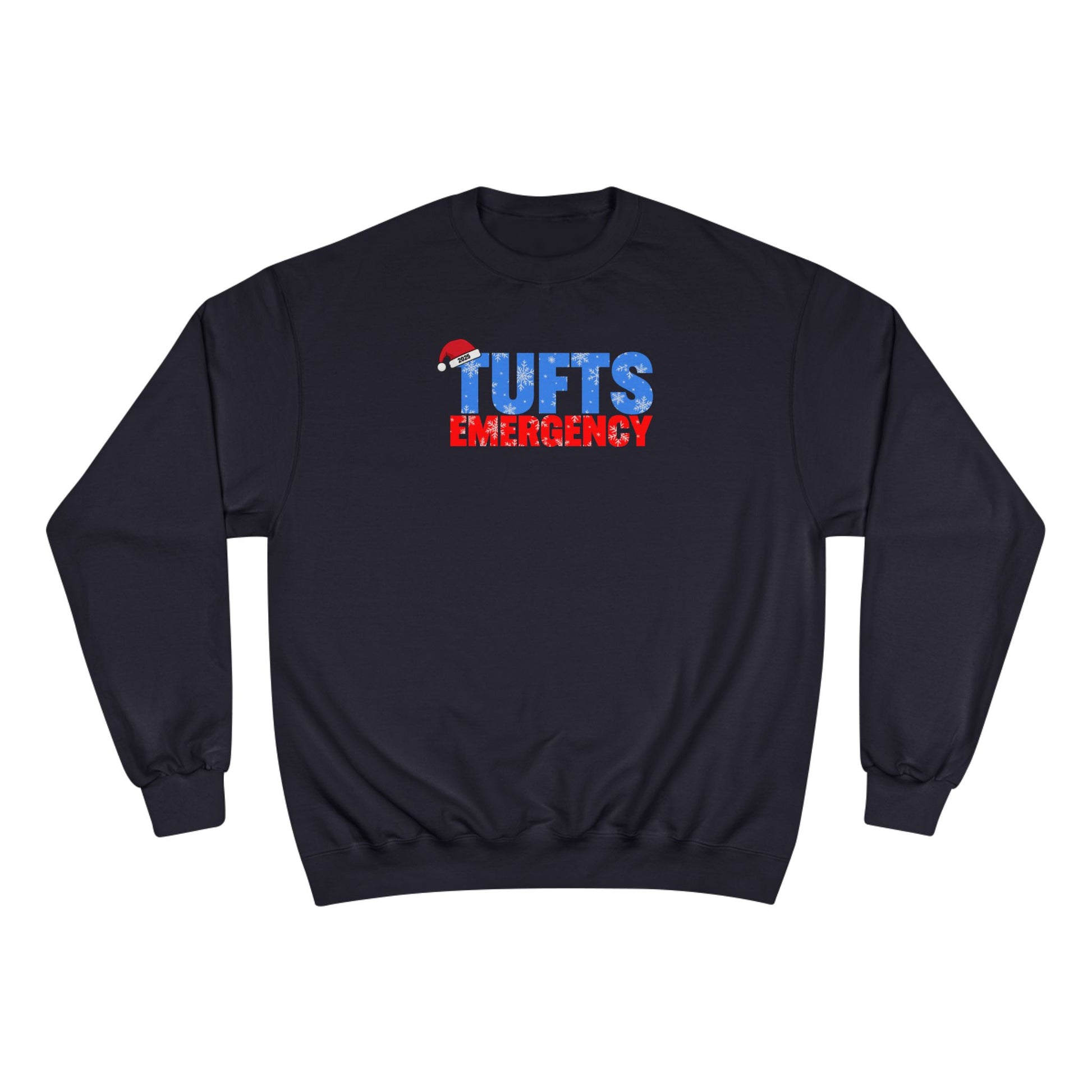 TUFTS Emergency Holiday Sweatshirt Celebrate the season with Boston spirit and emergency department pride. This cozy light gray sweatshirt features a bold "TUFTS EMERGENCY" graphic—distressed blue lettering topped with a festive red Santa hat, paired with striking red block text below. Designed for staff, supporters, and anyone who reps TUFTS.